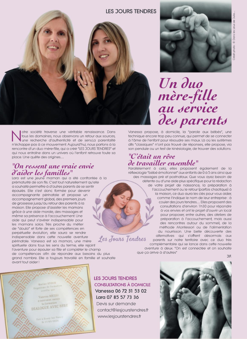 Les Jours Tendres, c’est une histoire entre mère et fille : Vanessa & Lara, réunies par la même passion. Ensemble, nous avons créé ce lieu d’accompagnement : bienveillant, remplit de tendresse – pour écouter, apaiser et prendre soin des familles et de leurs enfants dans leurs premiers pas avec bébé. Les Jours Tendres offre aux familles des soins doux et personnalisés, pour plus de sérénité et de tendresse au quotidien.